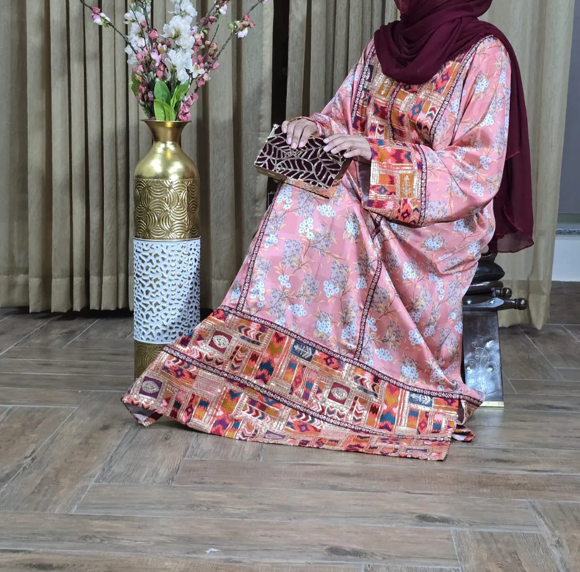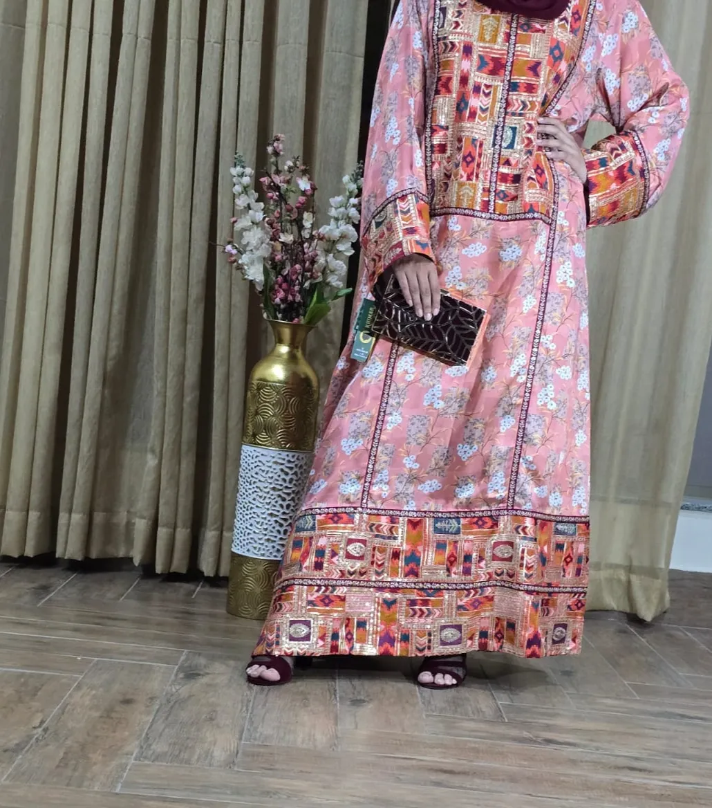 Crafted from high-quality printed silk, this abaya showcases a soft peach base with a delicate floral pattern, adding charm and sophistication.