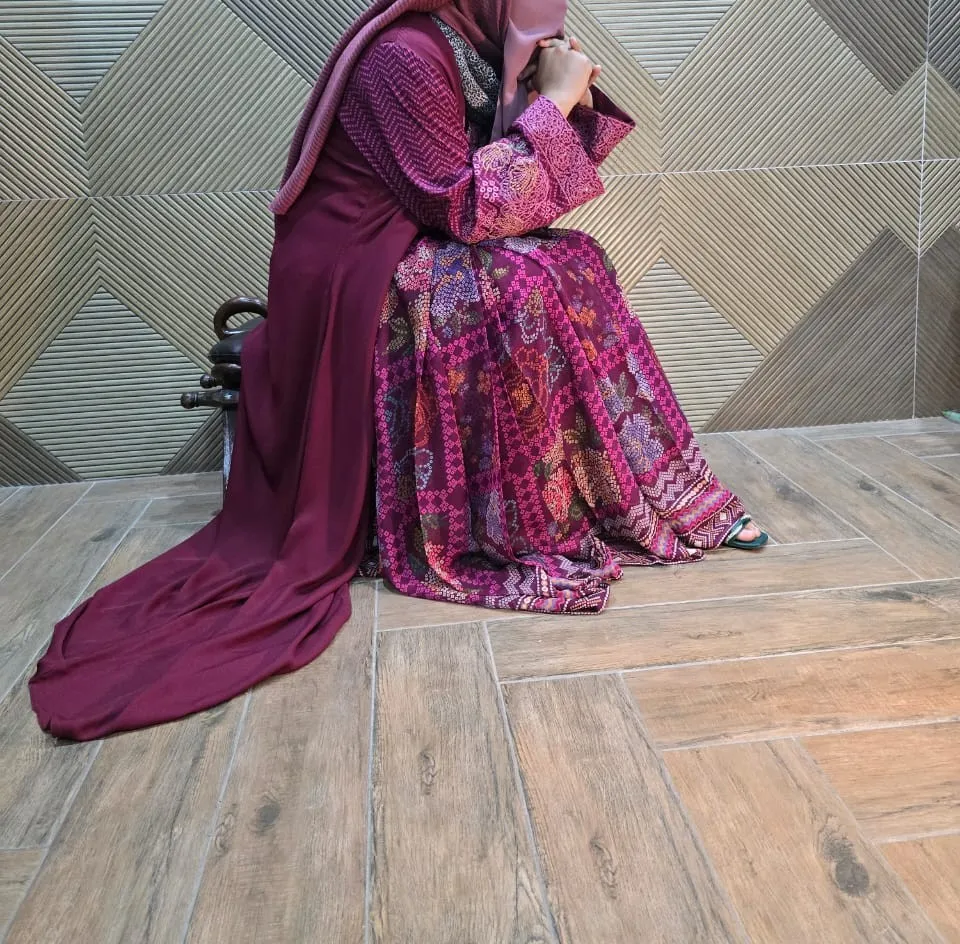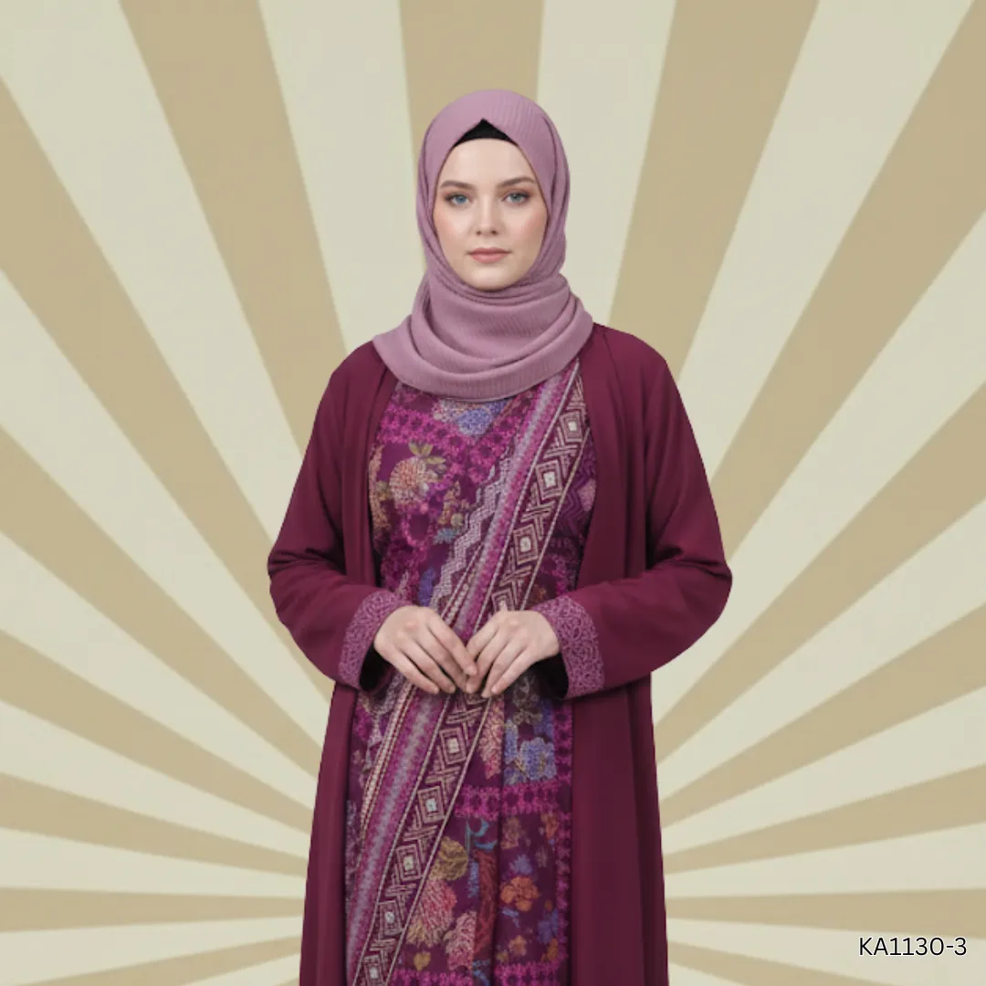 The Berry Bloom Abaya features a beautifully draped saree-style design, offering a timeless blend of cultural elegance and modern modesty.