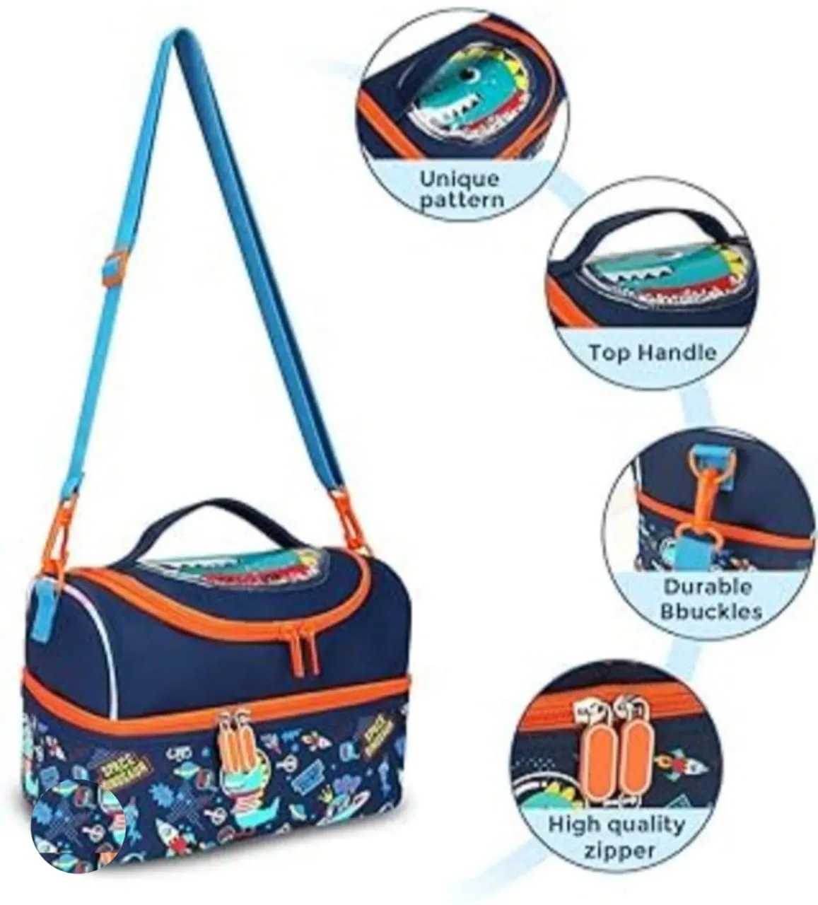 The double-decker compartments offer extra space to neatly separate meals and snacks, helping keep food fresh and organized throughout the day. A secure zip locking system helps prevent spills, while the durable yet lightweight construction ensures easy carrying. Equipped with a top handle and adjustable shoulder belt, it’s ideal for school, travel, and picnics.