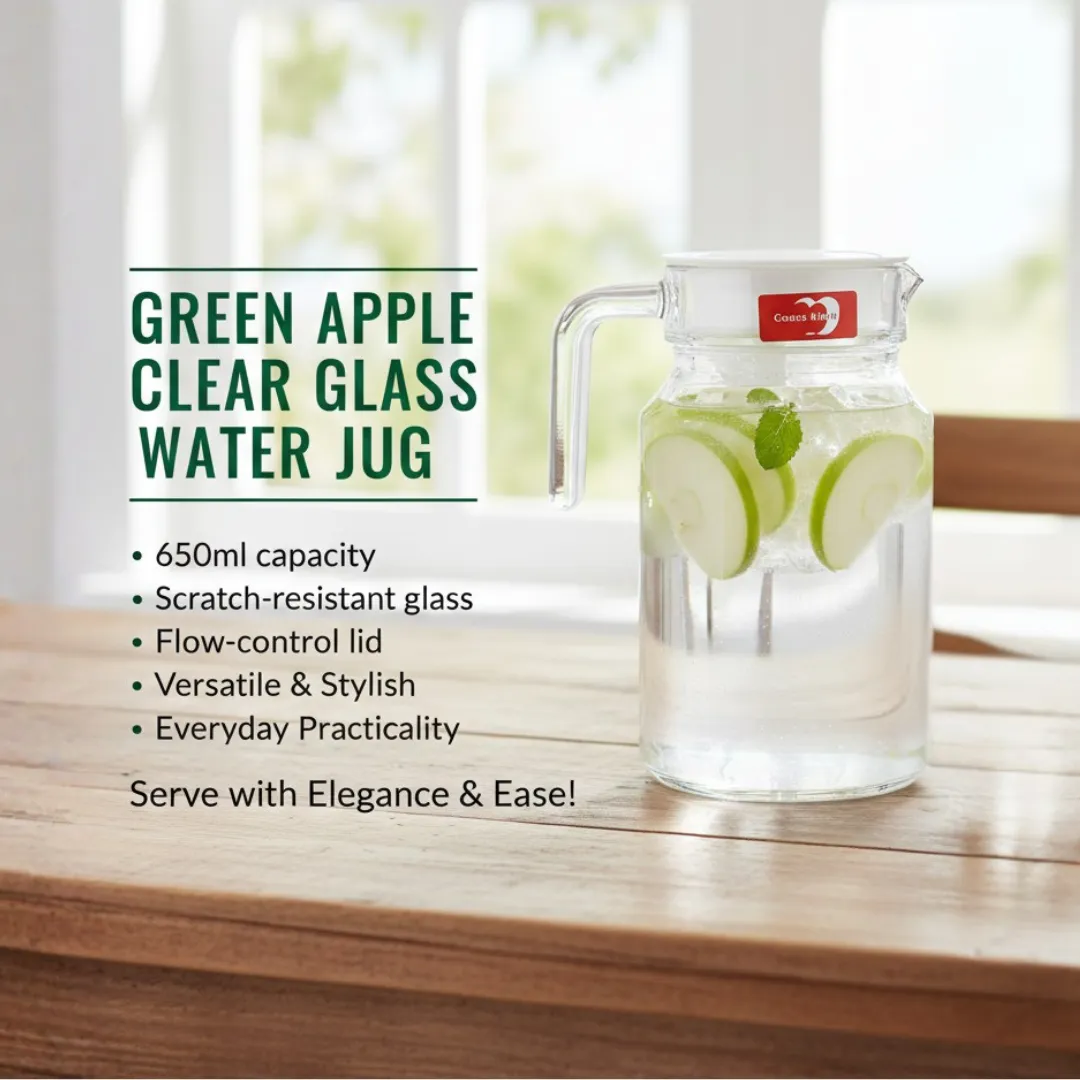 The Green Apple Clear Glass Water Jug is a versatile and stylish serving solution designed for daily use. Made from high-quality crystal-clear glass, this 650ml jug is ideal for serving water, juice, oil, sauces, and other beverages with ease and elegance.