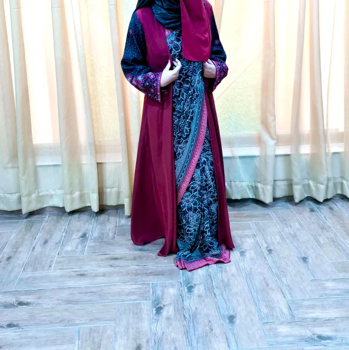 The Rose Radiance Abaya features a refined saree-style design, blending traditional charm with modest elegance for a beautifully draped look.